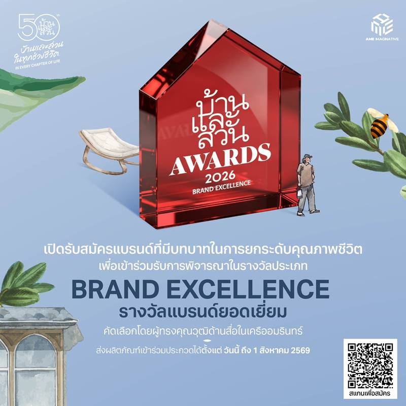 บ้านและสวนขอเชิญชวนแบรนด์ผู้ผลิตสินค้าเกี่ยวกับบ้าน การอยู่อาศัย วัสดุก่อสร้าง เครื่องใช้ไฟฟ้า เครื่องมือเครื่องใช้ในบ้าน และนวัตกรรมการอยู่อาศัย ร่วมส่งแนวทางการดำเนินงานหรือบทบาทของแบรนด์เข้าร่วมรับการพิจารณาในรางวัล บ้านและสวน Awards 2026 : Brand Excellence แบรนด์ที่ส่งเสริมคุณภาพการอยู่อาศัย คุณภาพชีวิต และสร้างสรรค์สังคมให้ดีขึ้น